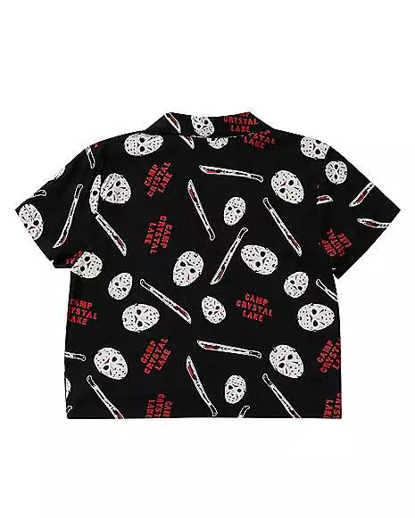 Show off your love of your favorite horror movie in this officially licensed Friday the 13th Jason Voorhees Tie Front Shirt! This soft and stylish short features Jason’s mask with his bloody knife and the words “Camp Crystal Lake.”